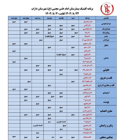 برنامه پزشکان کلینیک تخصصی بیمارستان امام حسن مجتبی(ع) داراب از روز شنبه مورخه۱۴۰۴/۰۸/۲۴ لغایت روز پنج شنبه مورخه ۱۴۰۴/۰۸/۳۰