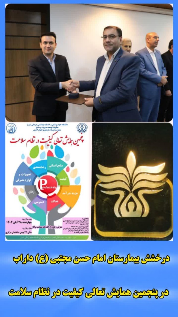 در همایش استانی تعالی کیفیت، بیمارستان امام حسن مجتبی (ع) داراب با عملکرد متفاوت در حوزه تحول اداری، موفق شد در جمع مقام‌های برتر از میان مراکز درمانی فارس قرار گیرد